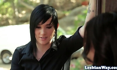 Strapon fucked girl-on-girl pleasured by goth dyke